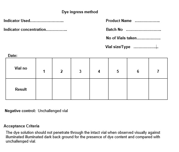The dye solution should not penetrate through the intact vials when observed visually against illuminated dark back ground for the presence of dye content and compared with unchallenged vial
