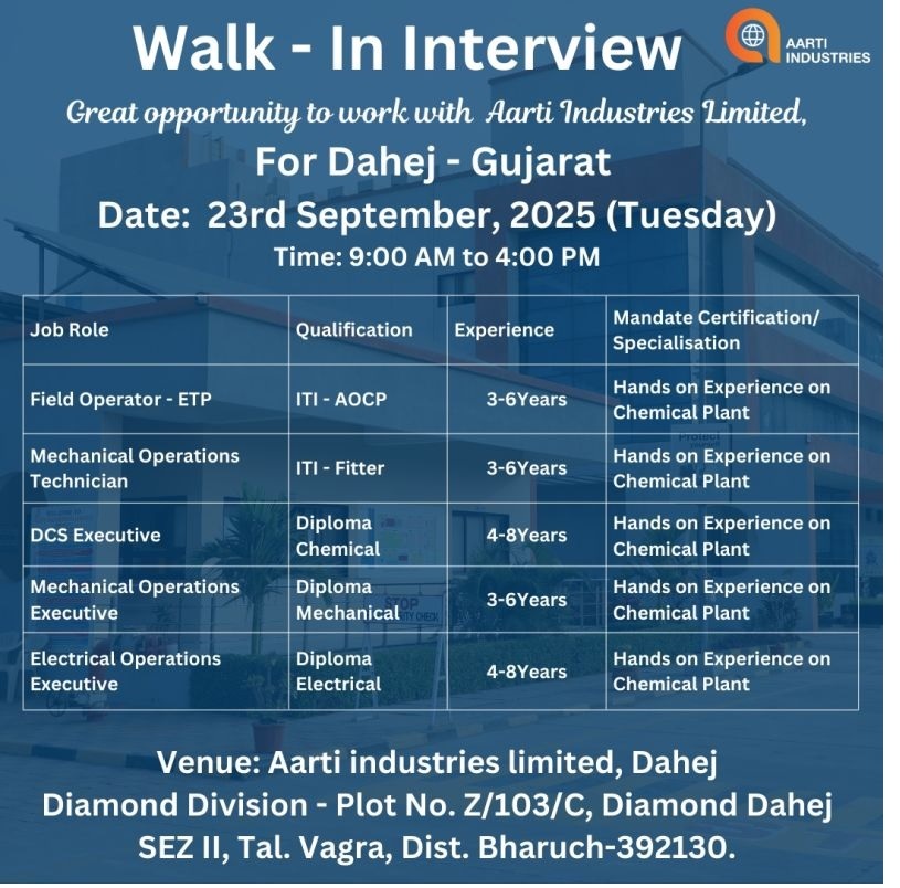 Aarti Industries-Walk In Interview For Multiple Position on 23rd September 2025