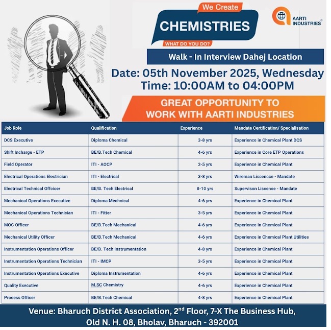 Aarti Industries Ltd. is hiring experienced professionals for its Dahej facility across multiple technical and operational roles. Candidates with relevant experience in chemical plant operations, instrumentation, utilities, and quality are invited to attend.