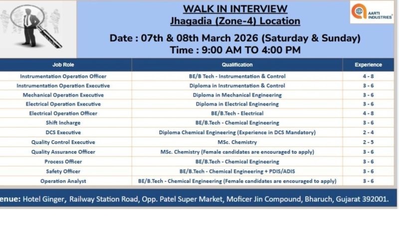 Interview Venue: Hotel Ginger, Railway Station Road, Opp. Patel Super Market, Moficer Jin Compound, Bharuch, Gujarat – 392001