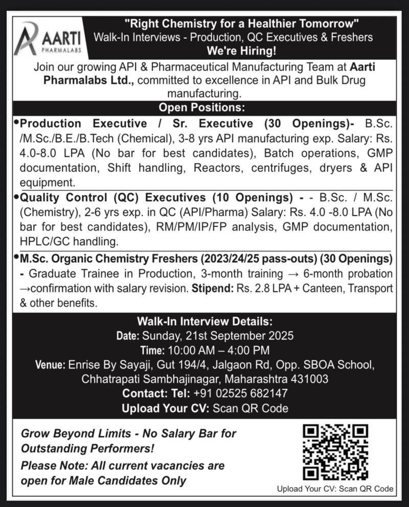 Aarti Pharmaceuticals -Walk-In Interviews For Production, QC Executives & Freshers on 21st September 2025 Aarti Pharmaceuticals -Walk-In Interviews For Production, QC Executives & Freshers on 21st September 2025 Post Views: 404 Job Category: Pharma Job Type: Full Time Job Location: Chhatrapati Sambhajinagar Apply for this position Full Name *Email *Phone *Cover Letter *Upload CV/Resume *Allowed Type(s): .pdf, .doc, .docxBy using this form you agree with the storage and handling of your data by this website. *