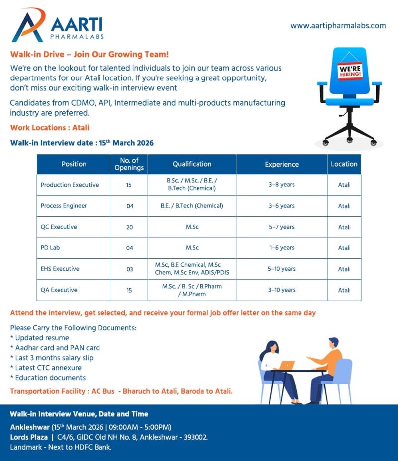 Aarti Pharmalabs- Walk-In Interview Production, Process Engineering, QC, PD Lab, EHS, & QA on 15th March 2026 Aarti Pharmalabs- Walk-In Interview Production, Process Engineering, QC, PD Lab, EHS, & QA on 15th March 2026 Post Views: 7 Job Category: Pharma Job Type: Full Time Job Location: Atali Apply for this position Full Name *Email *Phone *Cover Letter *Upload CV/Resume *Allowed Type(s): .pdf, .doc, .docxBy using this form you agree with the storage and handling of your data by this website. *