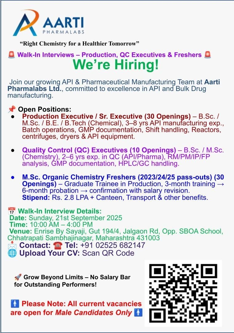 Aarti Pharmalabs- Walk In Interview For Production, QC Executives & Freshers on 21st Sept’ 2025 Aarti Pharmalabs- Walk In Interview For Production, QC Executives & Freshers on 21st Sept’ 2025 Post Views: 176 Job Category: Pharma Job Type: Full Time Job Location: Chhatrapati Sambhajinagar Apply for this position Full Name *Email *Phone *Cover Letter *Upload CV/Resume *Allowed Type(s): .pdf, .doc, .docxBy using this form you agree with the storage and handling of your data by this website. *