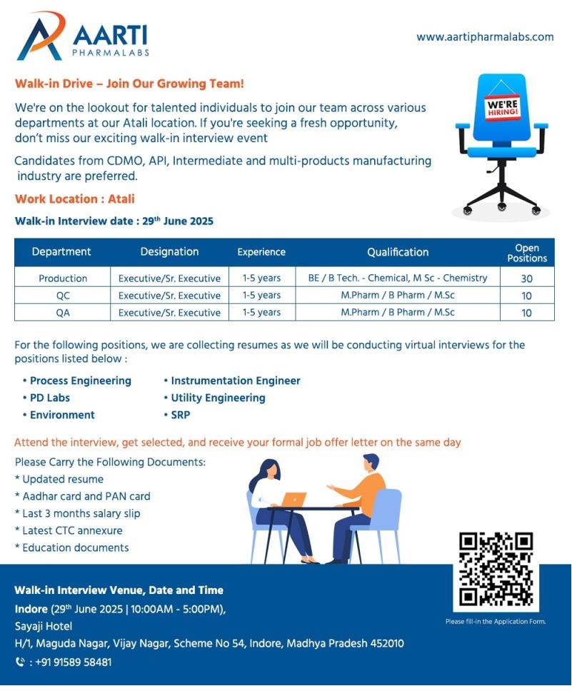 Aarti- Walk-In Interview For Production, QC & QA on 29th June 2025 Aarti- Walk-In Interview For Production, QC & QA on 29th June 2025 Post Views: 177 Job Category: Pharma Job Type: Full Time Job Location: Atali Apply for this position Full Name *Email *Phone *Cover Letter *Upload CV/Resume *Allowed Type(s): .pdf, .doc, .docxBy using this form you agree with the storage and handling of your data by this website. *