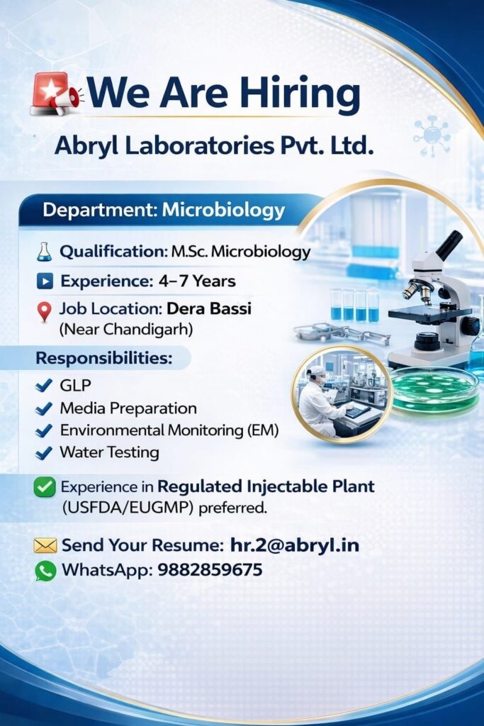 Abryl Laboratories – Hiring Microbiologist Careers @ Dera Bassi Abryl Laboratories – Hiring Microbiologist Careers @ Dera Bassi Post Views: 10 Job Category: Pharma Job Type: Full Time Job Location: Derabassi Apply for this position Full Name *Email *Phone *Cover Letter *Upload CV/Resume *Allowed Type(s): .pdf, .doc, .docxBy using this form you agree with the storage and handling of your data by this website. *