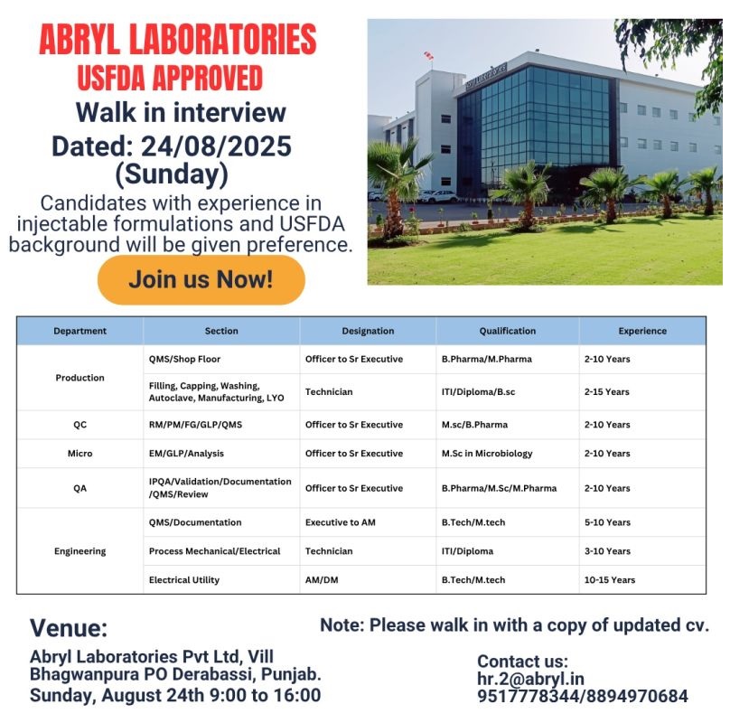 Abryl Laboratories -Walk-In Interview For Production, Packing, Engineering, QA & QC on 24th August 2025