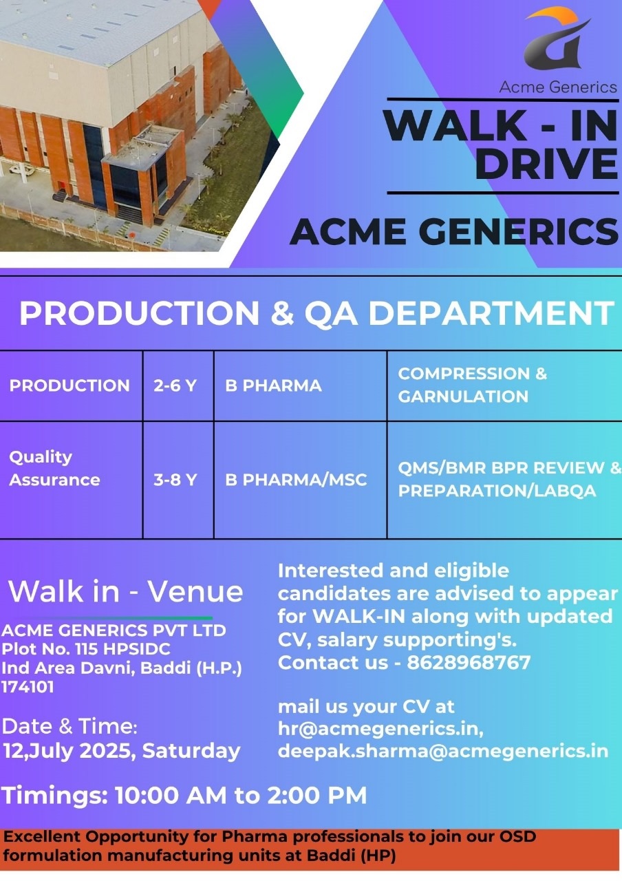 Acme Generics is holding a walk-in drive for positions in their Production & QA Department at their Baddi (H.P.) facility.