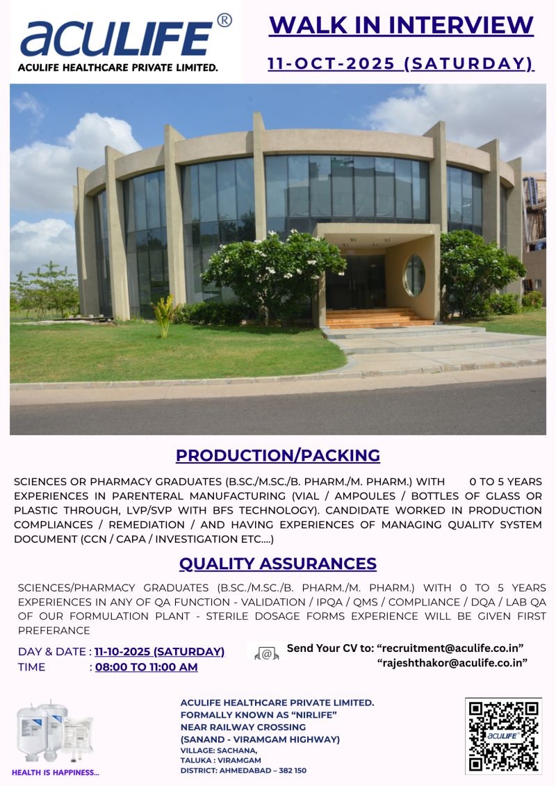 Aculife Healthcare-Walk in Drive for M.Pharm, B.Pharm, MSc in Production, QA on 11-10-2025