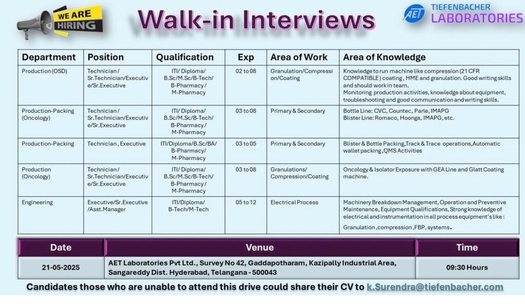 AET Laboratories-Walk-In Interviews for, Packing, Engineering on 21-05-2025