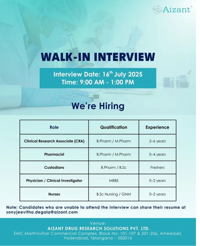Aizant Drug-Walk in drive on 16th July,2025 Aizant Drug-Walk in drive on 16th July,2025 Post Views: 159 Job Category: Pharma Job Type: Full Time Job Location: Hyderabad Apply for this position Full Name *Email *Phone *Cover Letter *Upload CV/Resume *Allowed Type(s): .pdf, .doc, .docxBy using this form you agree with the storage and handling of your data by this website. *