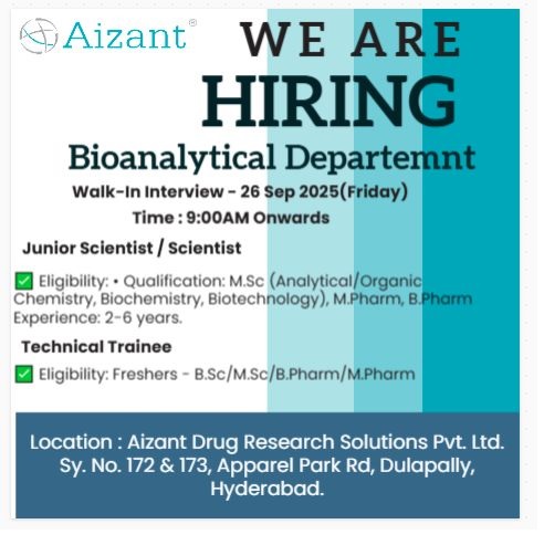 Aizant Pharma- Walk In Interview For Fresher & Experienced on 26 Sep 2025 Aizant Pharma- Walk In Interview For Fresher & Experienced on 26 Sep 2025 Post Views: 354 Job Category: Pharma Job Type: Full Time Job Location: Hyderabad Apply for this position Full Name *Email *Phone *Cover Letter *Upload CV/Resume *Allowed Type(s): .pdf, .doc, .docxBy using this form you agree with the storage and handling of your data by this website. *