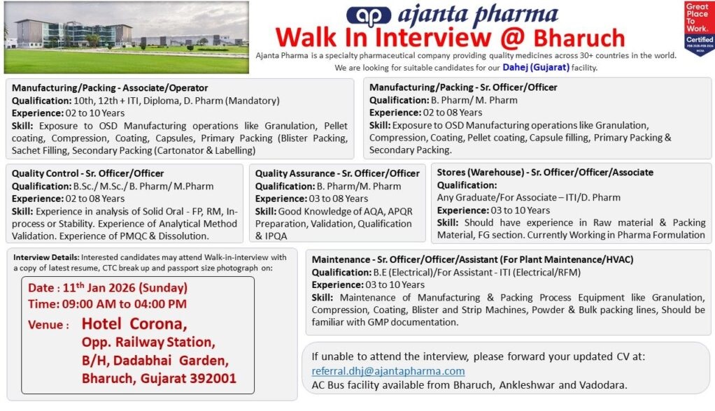 Ajanta Pharma- Walk in for Manufacturing, Packing, QA, QC, Production on 11th Jan 2026