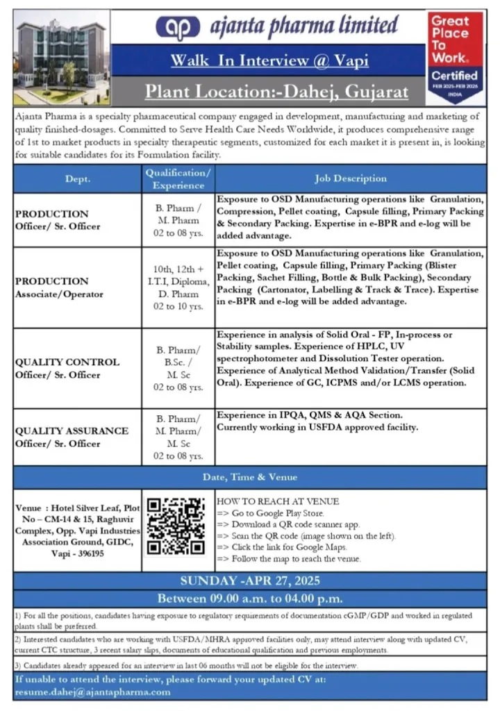 Ajanta Pharma Limited, a leading specialty pharmaceutical company, has announced a walk-in interview for various positions in Production, Quality Control (QC), and Quality Assurance (QA) at its formulation facility in Dabei, Gujarat.