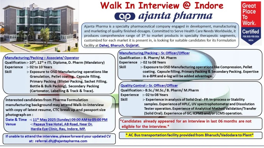 Ajanta Pharma-Walk in Drive for D.Pharm, B.Pharm, M.Pharm in QC, Packing, Manufacturing on 11th May 2025@ Rau, Indore, MP.
