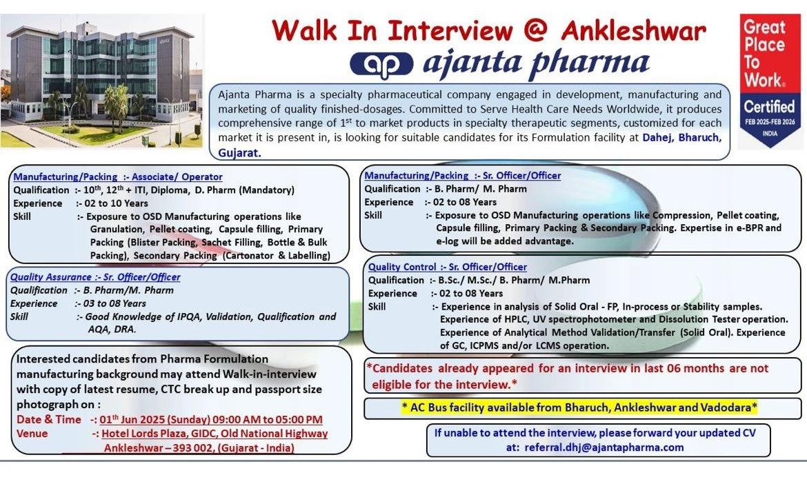 Ajanta Pharma is a specialty pharmaceutical company engaged in development, manufacturing and marketing of quality finished-dosages. Committed to Serve Health Care Needs Worldwide, it produces comprehensive range of 1st to market products in specialty therapeutic segments, customized for each market it is present in, is looking for suitable candidates for its Formulation facility at Dahej, Bharuch, Gujarat