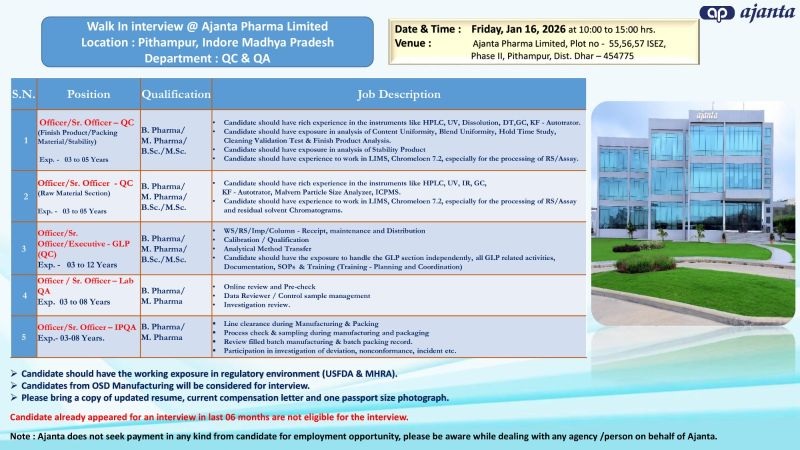 Ajanta Pharma -Walk-In Interview for QC & QA on16 January 2026