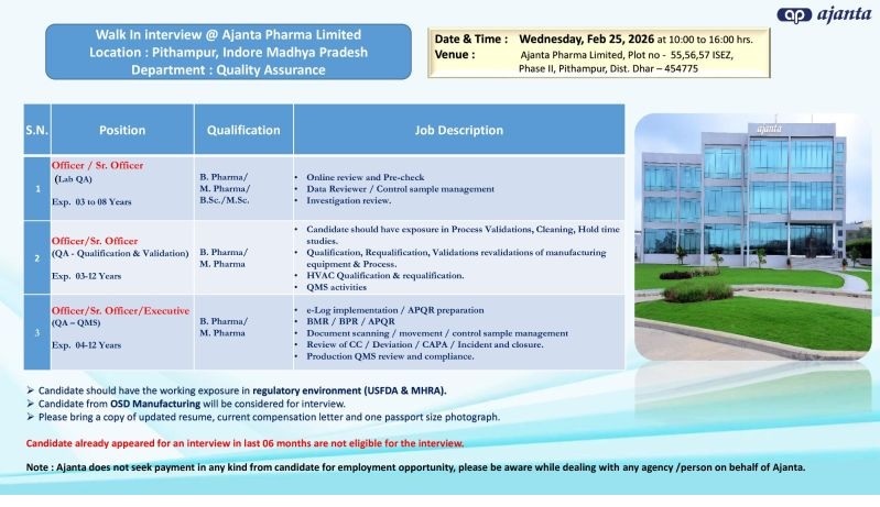Ajanta Pharma -Walk-In Interview for Quality Assurance on Feb 25, 2026