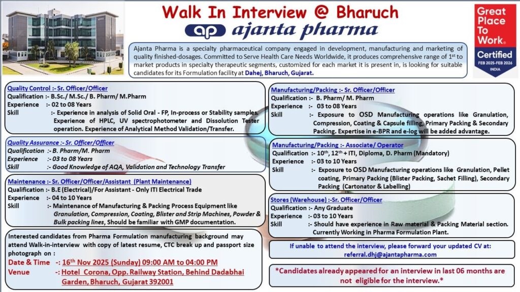 Ajanta Pharma-Walk-In Interview for Multiple Departments on 16th November 2025 @Bharuch