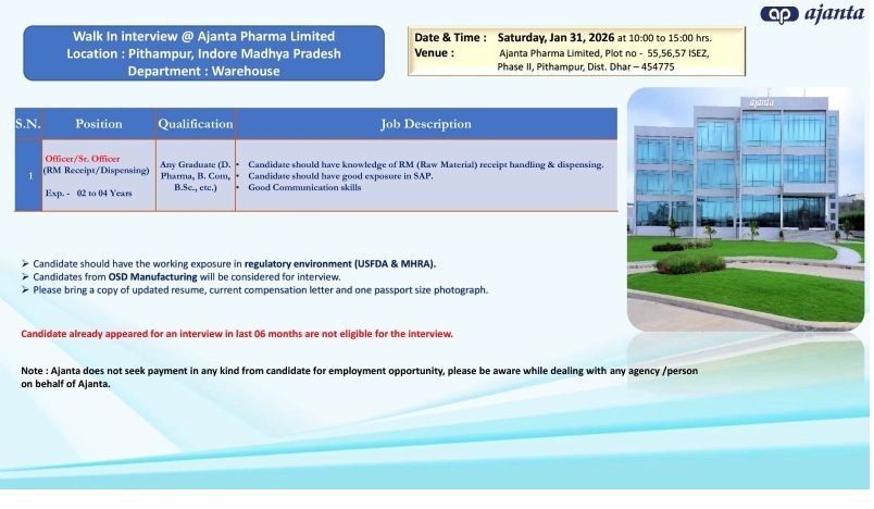 Ajanta Pharma Limited is conducting a Walk-In Interview for Warehouse (RM Receipt/Dispensing) roles at its Pithampur, Madhya Pradesh facility. This opportunity is ideal for candidates experienced in Raw Material handling, SAP, and regulated pharmaceutical environments.