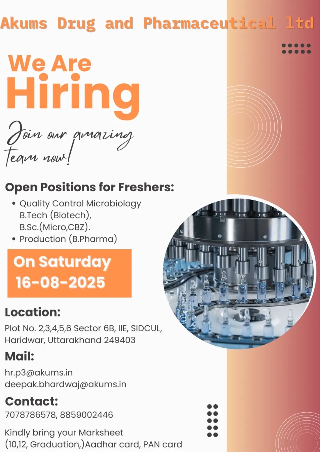 Akums Drugs -Walk in for Quality Control & Production on 16th August 2025 Akums Drugs -Walk in for Quality Control & Production on 16th August 2025 Post Views: 246 Apply for this position Full Name *Email *Phone *Cover Letter *Upload CV/Resume *Allowed Type(s): .pdf, .doc, .docxBy using this form you agree with the storage and handling of your data by this website. *