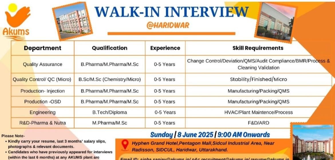 Akums -Walk In Interview For Freshers & Experienced on June 8, 2025 @Haridwar, Uttarakhand Akums -Walk In Interview For Freshers & Experienced on June 8, 2025 @Haridwar, Uttarakhand Post Views: 1,377 Job Category: Pharma Job Type: Full Time Job Location: Haridwar Apply for this position Full Name *Email *Phone *Cover Letter *Upload CV/Resume *Allowed Type(s): .pdf, .doc, .docxBy using this form you agree with the storage and handling of your data by this website. *