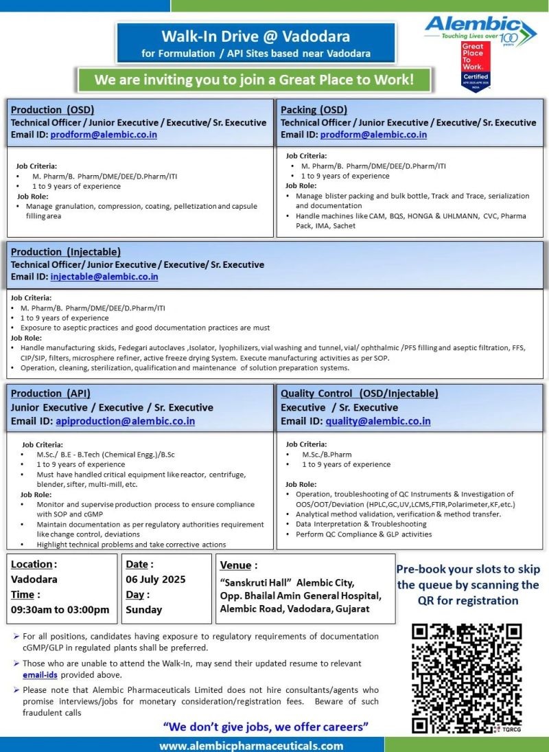 Alembic Pharma- Walk in Drive for D.Pharm, B.Pharm, M.Pharm, MSc in Production, Packing, QC on 6th July 2025