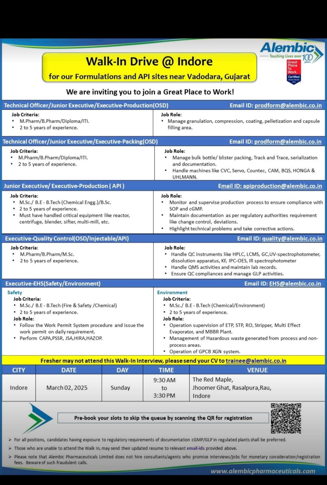 Walk-In Drive Indore for Formulations and API sites near Vadodara, Gujarat