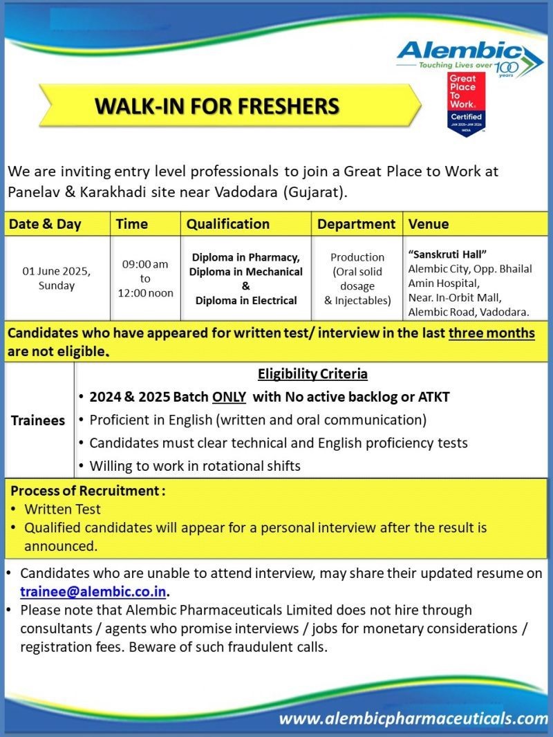 Alembic Pharmaceuticals- Walk In For Freshers – Diploma in Pharmacy/ Mechanical and Electrical on June 1, 2025 Alembic Pharmaceuticals- Walk In For Freshers – Diploma in Pharmacy/ Mechanical and Electrical on June 1, 2025 Post Views: 1,055 Job Category: Pharma Job Type: Full Time Job Location: Vadodara Apply for this position Full Name *Email *Phone *Cover Letter *Upload CV/Resume *Allowed Type(s): .pdf, .doc, .docxBy using this form you agree with the storage and handling of your data by this website. *
