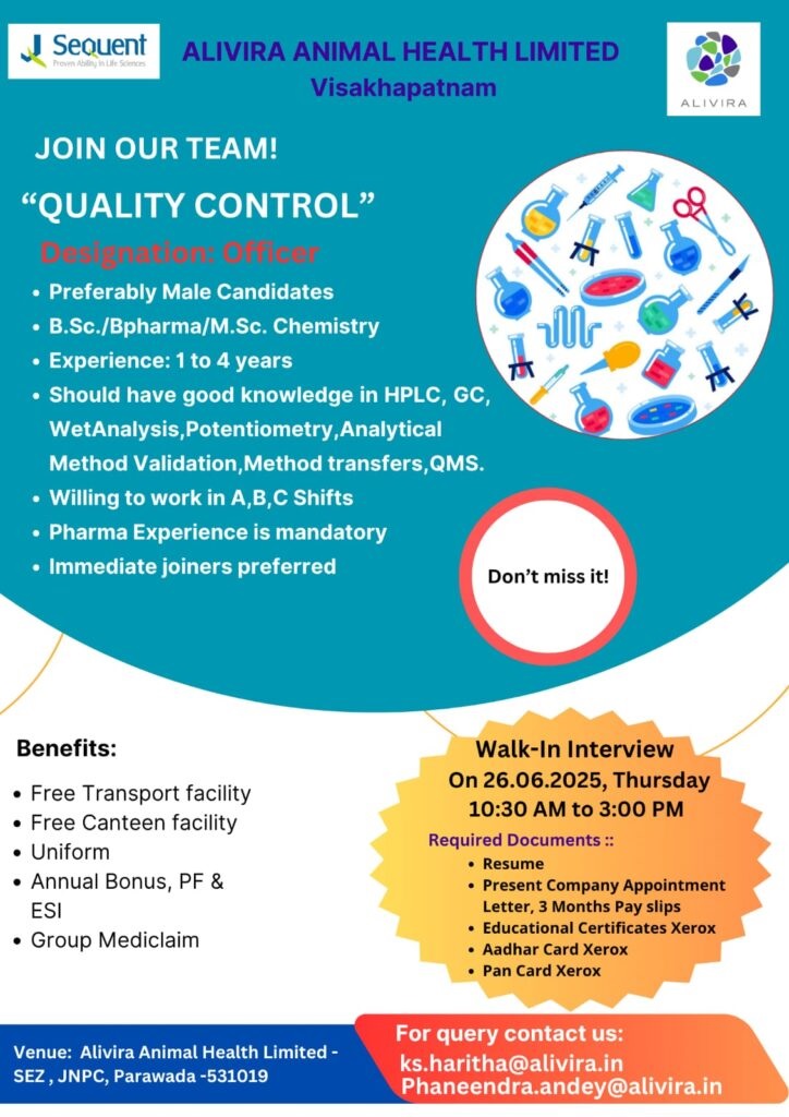 Alivira Animal Health Limited – Walk-in Interview for Quality Control Officers on 26th June 2025@Visakhapatnam Alivira Animal Health Limited – Walk-in Interview for Quality Control Officers on 26th June 2025@Visakhapatnam Post Views: 436 Job Category: Pharma Job Type: Full Time Job Location: /Visakhapatnam Apply for this position Full Name *Email *Phone *Cover Letter *Upload CV/Resume *Allowed Type(s): .pdf, .doc, .docxBy using this form you agree with the storage and handling of your data by this website. *