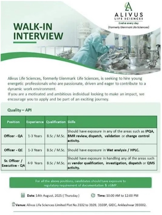 Alivus Life Sciences (Glenmark Life Sciences) – Walk- In Interviews for Multiple Positions on 14th Aug’ 2025