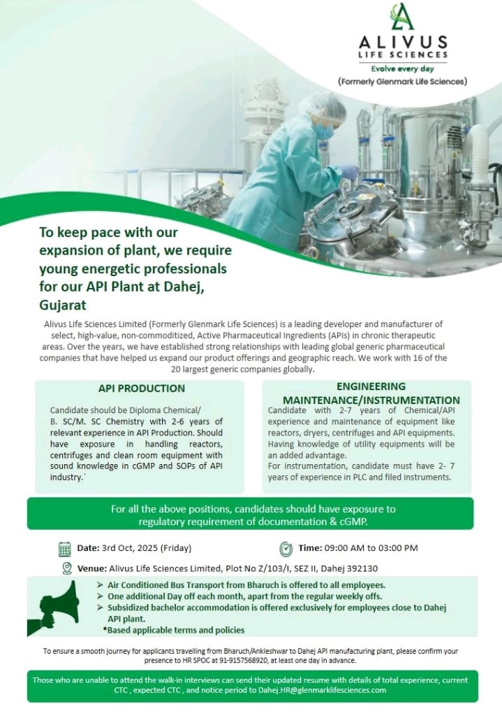 Alivus Life Sciences- Walk in Interview For Leading API Production & Engineering  3rd Oct 2025@, Dahej, Gujarat