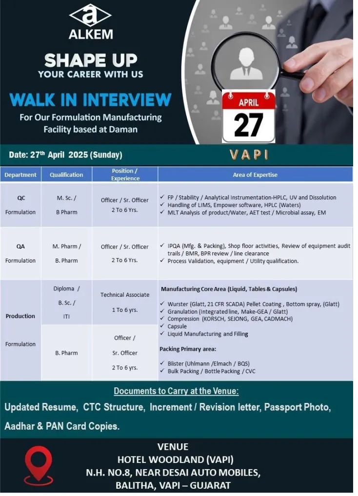 Alkem Laboratories-Walk in for M.Pharm, B.Pharm, M.Sc in QA, QC, Production Formulation on 27th April 2025