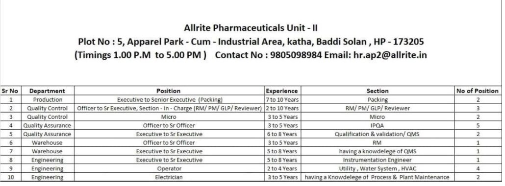 Interested candidates who meet the experience criteria are encouraged to reach out to the HR department of Allrite Pharmaceuticals.