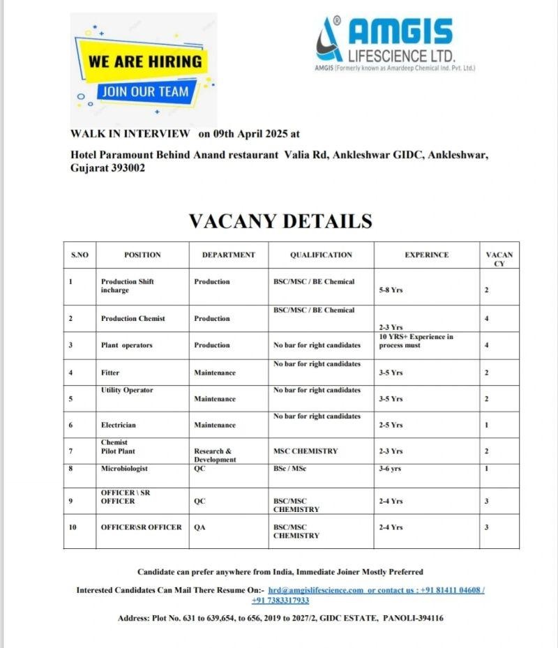 WALK in Interview on 09th April 2025 at 9:30 AM to 04:00 PM at Hotel Paradise Omkar complex, Ankleshwar – Valia road, GIDC Ankleshwar Gujarat-393001.