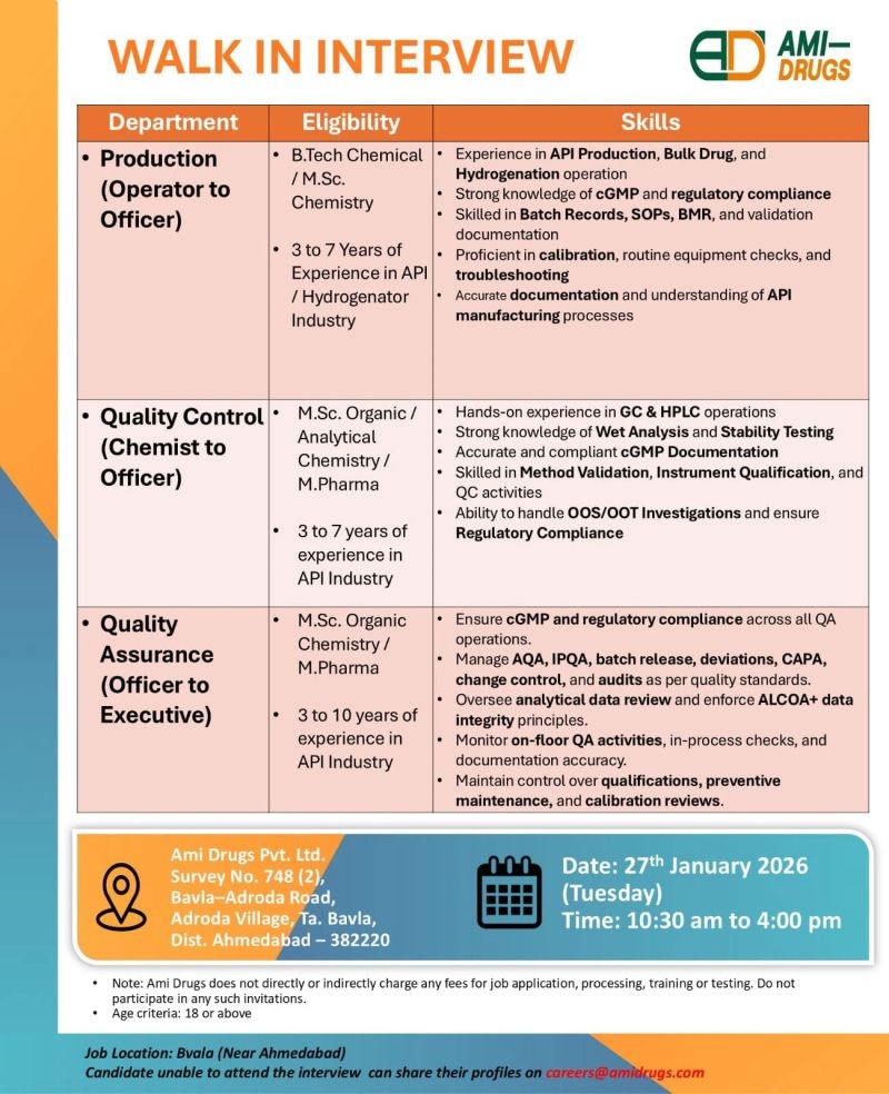Ami Drugs- Walk-In Interview Production, QC, QA on 27 January 2026 @Ahmedabad Ami Drugs- Walk-In Interview Production, QC, QA on 27 January 2026 @Ahmedabad Post Views: 35 Job Category: Pharma Job Type: Full Time Job Location: Bavla (Near Ahmedabad) Apply for this position Full Name *Email *Phone *Cover Letter *Upload CV/Resume *Allowed Type(s): .pdf, .doc, .docxBy using this form you agree with the storage and handling of your data by this website. *