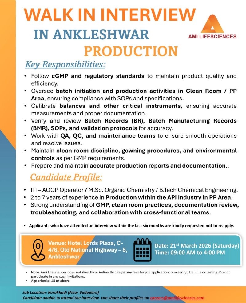 Ami Lifesciences -Walk-In Drive for API Production on 21st March 2026 @ Ankleshwar Ami Lifesciences -Walk-In Drive for API Production on 21st March 2026 @ Ankleshwar Post Views: 7 Job Category: Pharma Job Type: Full Time Job Location: Ankleshwar Apply for this position Full Name *Email *Phone *Cover Letter *Upload CV/Resume *Allowed Type(s): .pdf, .doc, .docxBy using this form you agree with the storage and handling of your data by this website. *