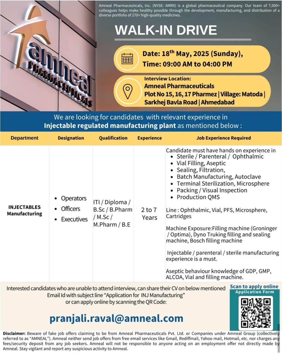 Amneal Pharmaceuticals-Walk in Drive for M.Pharm, B.Pharm, MSc in Injectables Manufacturing on 18th May, 2025