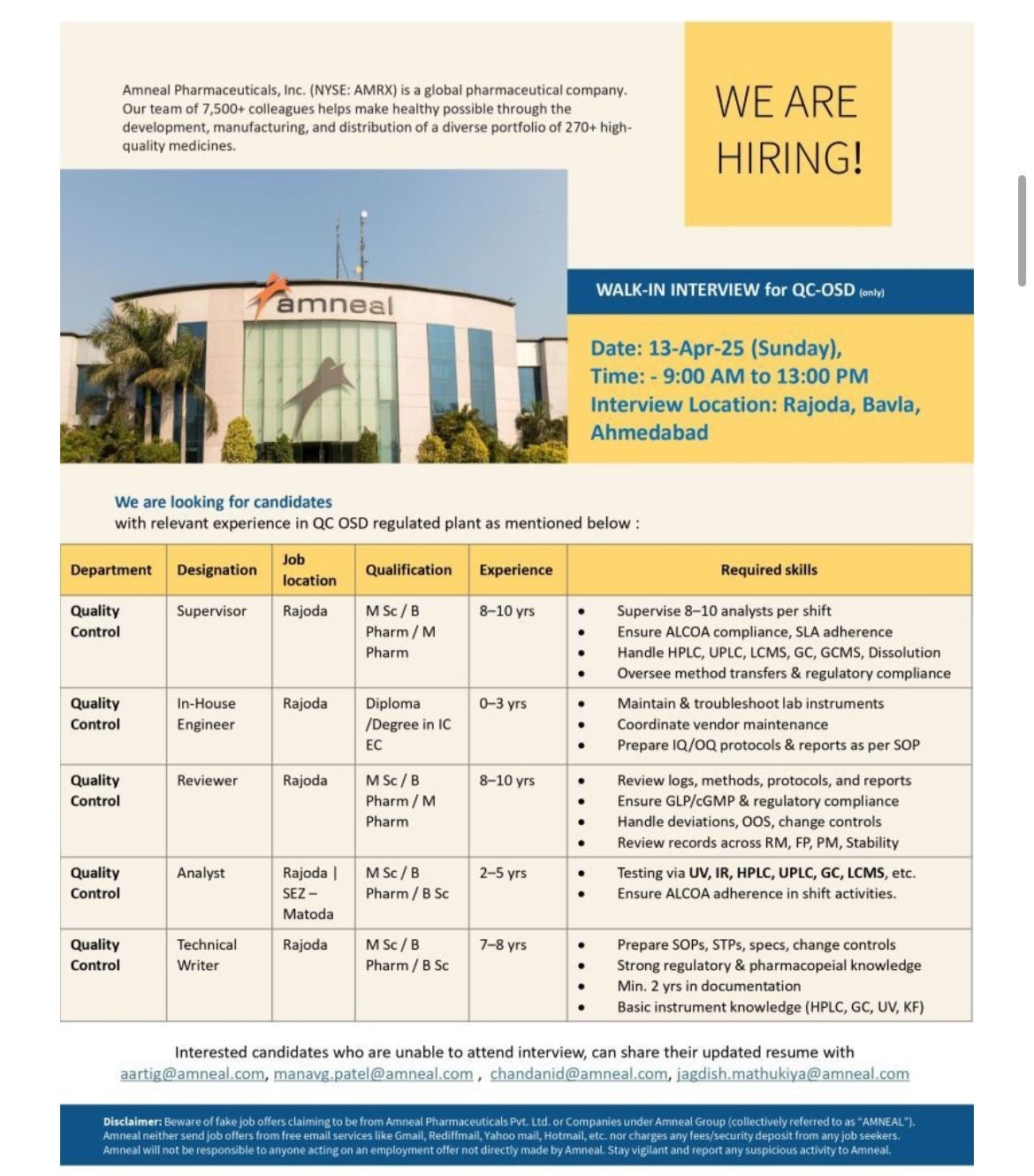 Qualification : M.Sc / B.Pharm / M.Pharm
