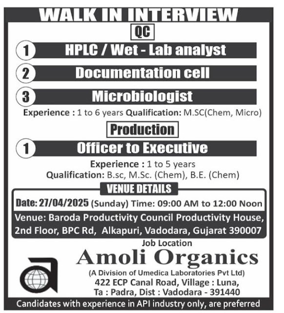 Amoli Organics -Walk In Interview For BSc/ MSc/ BE Chemical on 27th April 2025 Amoli Organics -Walk In Interview For BSc/ MSc/ BE Chemical on 27th April 2025 Post Views: 528 Job Category: Pharma Job Type: Full Time Job Location: Gujarat Apply for this position Full Name *Email *Phone *Cover Letter *Upload CV/Resume *Allowed Type(s): .pdf, .doc, .docxBy using this form you agree with the storage and handling of your data by this website. *