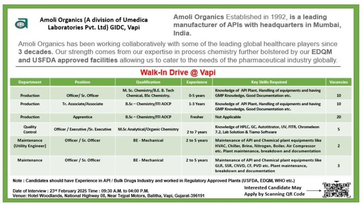 Note: Candidates should have Experience in API/Bulk Drugs Industry and worked in Regulatory Approved Plants (USFDA, EDQM, WHO etc.)