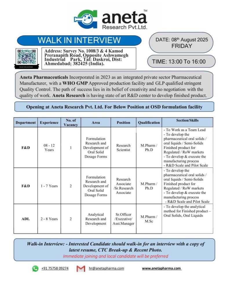 Aneta Pharma-Walk-In Drive for F&D & ADL Roles on 8th August 2025
