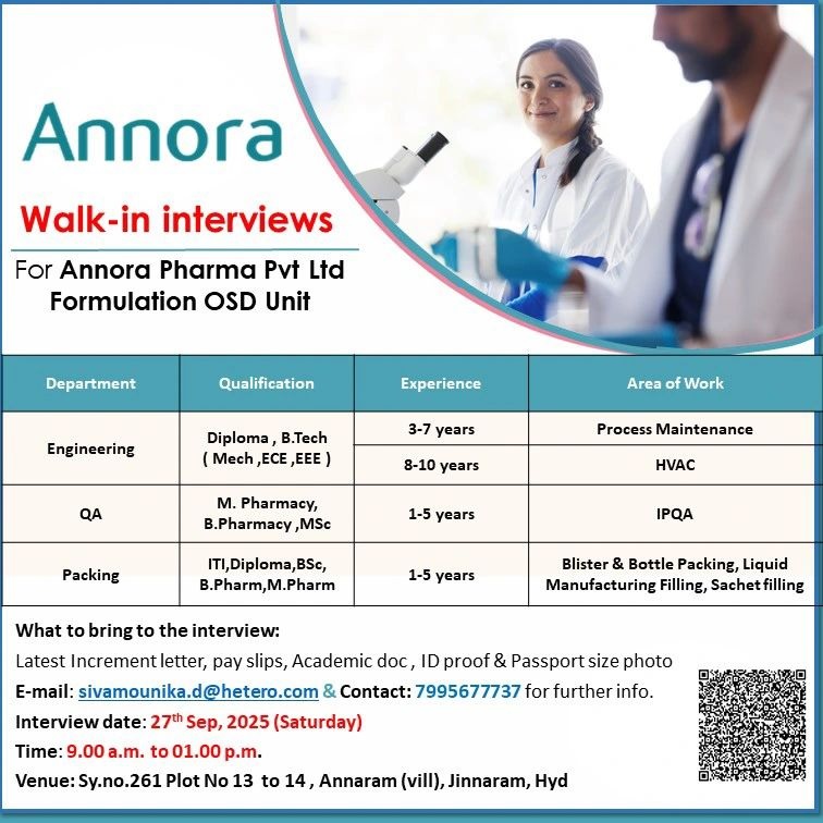 Walk-in interviews for Annora Pharma Pvt Ltd Formulation OSD Unit