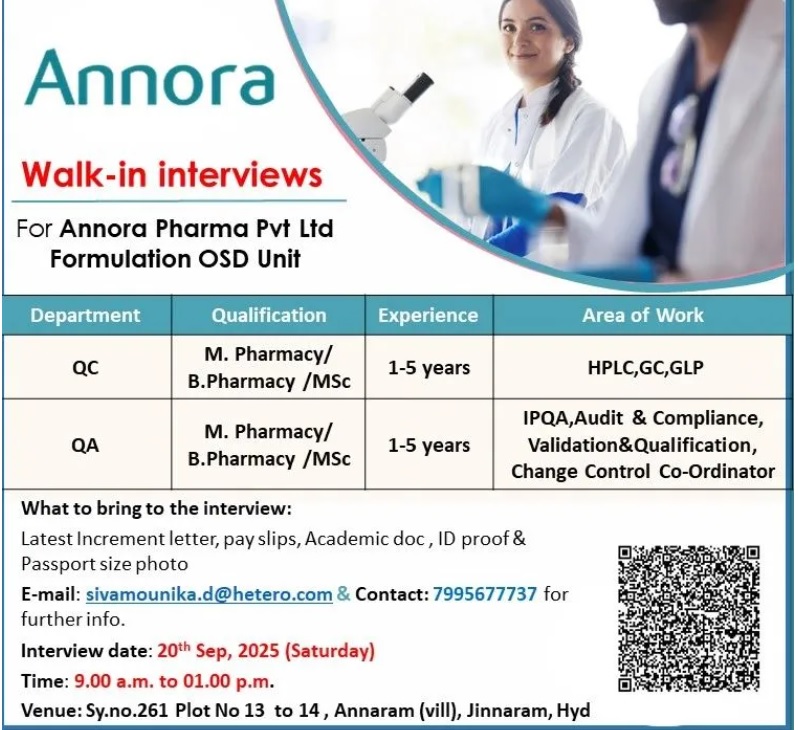 Annora Pharma Pvt. Ltd-Walk-In Interview for QC/QA on 20th Sep’ 2025