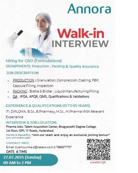 Annora Pharma- Walk-In – OSD Production, Packing & QA on 27th July 2025