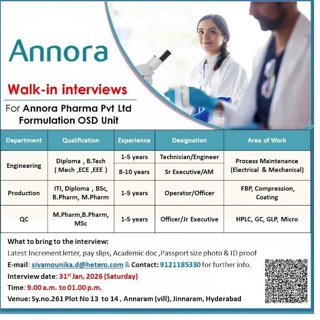 Annora Pharma -Walk-In Interview for Engineering, Production & QC on 31st January 2026 @ Hyderabad Annora Pharma -Walk-In Interview for Engineering, Production & QC on 31st January 2026 @ Hyderabad Post Views: 25 Job Category: Pharma Job Type: Full Time Job Location: Hyderabad Apply for this position Full Name *Email *Phone *Cover Letter *Upload CV/Resume *Allowed Type(s): .pdf, .doc, .docxBy using this form you agree with the storage and handling of your data by this website. *