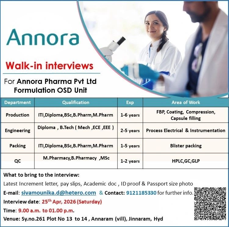 Annora Pharma- Walk In Interview for Production, Engineering, Packing, & Quality Control on 25th Apr, 2026 Annora Pharma- Walk In Interview for Production, Engineering, Packing, & Quality Control on 25th Apr, 2026 Post Views: 25 Job Category: Pharma Job Type: Full Time Job Location: Hyderabad Apply for this position Full Name *Email *Phone *Cover Letter *Upload CV/Resume *Allowed Type(s): .pdf, .doc, .docxBy using this form you agree with the storage and handling of your data by this website. *