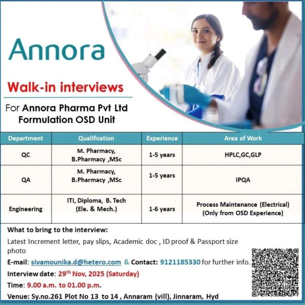 Annora Pharma Pvt Ltd is hosting walk-in interviews for its Formulation OSD (Oral Solid Dosage) Unit in Hyderabad! We are seeking talented, experienced, and qualified professionals to join our dynamic teams in Quality Control (QC), Quality Assurance (QA), and Engineering.