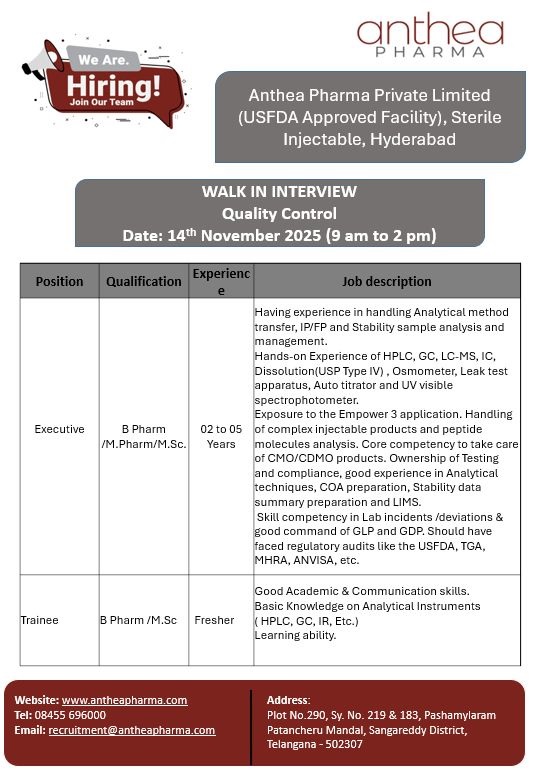 Job description : Having experience in handling Analytical method transfer, IP/FP and Stability sample analysis and management. Hands-on Experience of HPLC, GC, LC-MS. 1C, Dissolution(USP Type IV). Osmometer. Leak test apparatus. Auto titrator and UV visible spectrophotometer. Exposure to the Empower 3 application. Handling of complex injectable products and peptide molecules analysis. Core competency to take care of CMO/CDMO products. Ownership of Testing and compliance, good experience in Analytical techniques, COA preparation. Stability data summary preparation and LIMS. Skill competency in Lab incidents /deviations & good command of GLP and GDP. Should have faced regulatory audits like the USFDA, TGA, MHRA. ANVISA, etc.