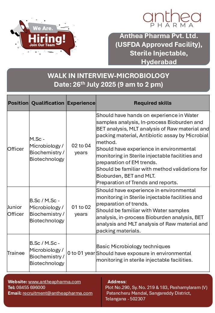 Anthea Pharma-Walk in Drive for MSc, BSc in Microbiology on 26th July 2025