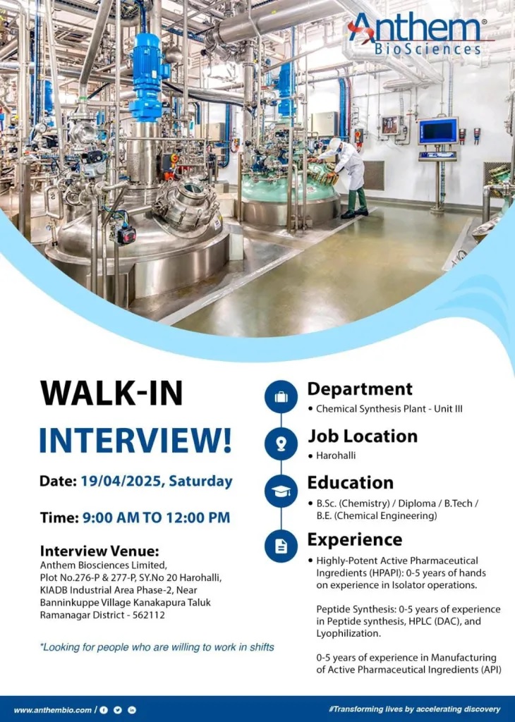 Anthem Biosciences- Walk-In Drive on 19 April 2025 Anthem Biosciences- Walk-In Drive on 19 April 2025 Post Views: 1,270 Job Category: Pharma Job Type: Full Time Job Location: Harohalli Apply for this position Full Name *Email *Phone *Cover Letter *Upload CV/Resume *Allowed Type(s): .pdf, .doc, .docxBy using this form you agree with the storage and handling of your data by this website. *